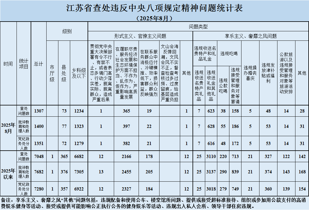2025年8月,全省共查處違反中央八項規定精神問題1307起,批評教育和處理1400人、其中給予黨紀政務處分1351人。從問題類型看,查處形式主義、官僚主義問題386起、批評教育和處理421人,查處享樂主義、奢靡之風問題921起、批評教育和處理979人。從人員級別看,批評教育和處理縣處級干部77人、鄉科級及以下人員1323人。